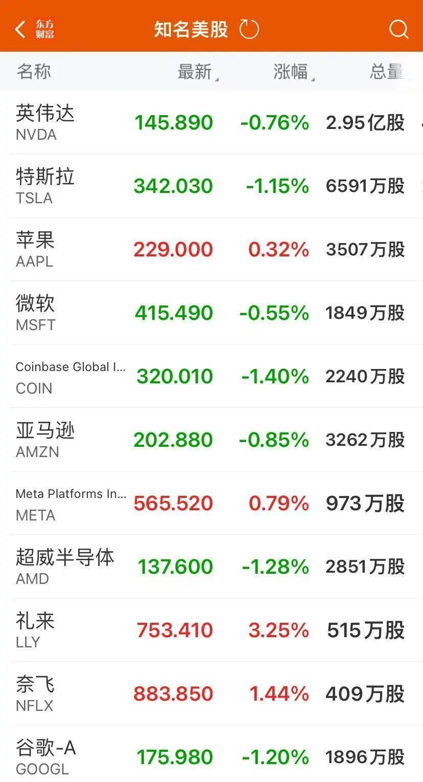 大型科技股多数下跌,苹果涨0.32%,微软跌0.55%,英伟达跌0.76%,谷歌跌1.20%,亚马逊跌0.85%,Meta涨0.79%,特斯拉跌1.15%。